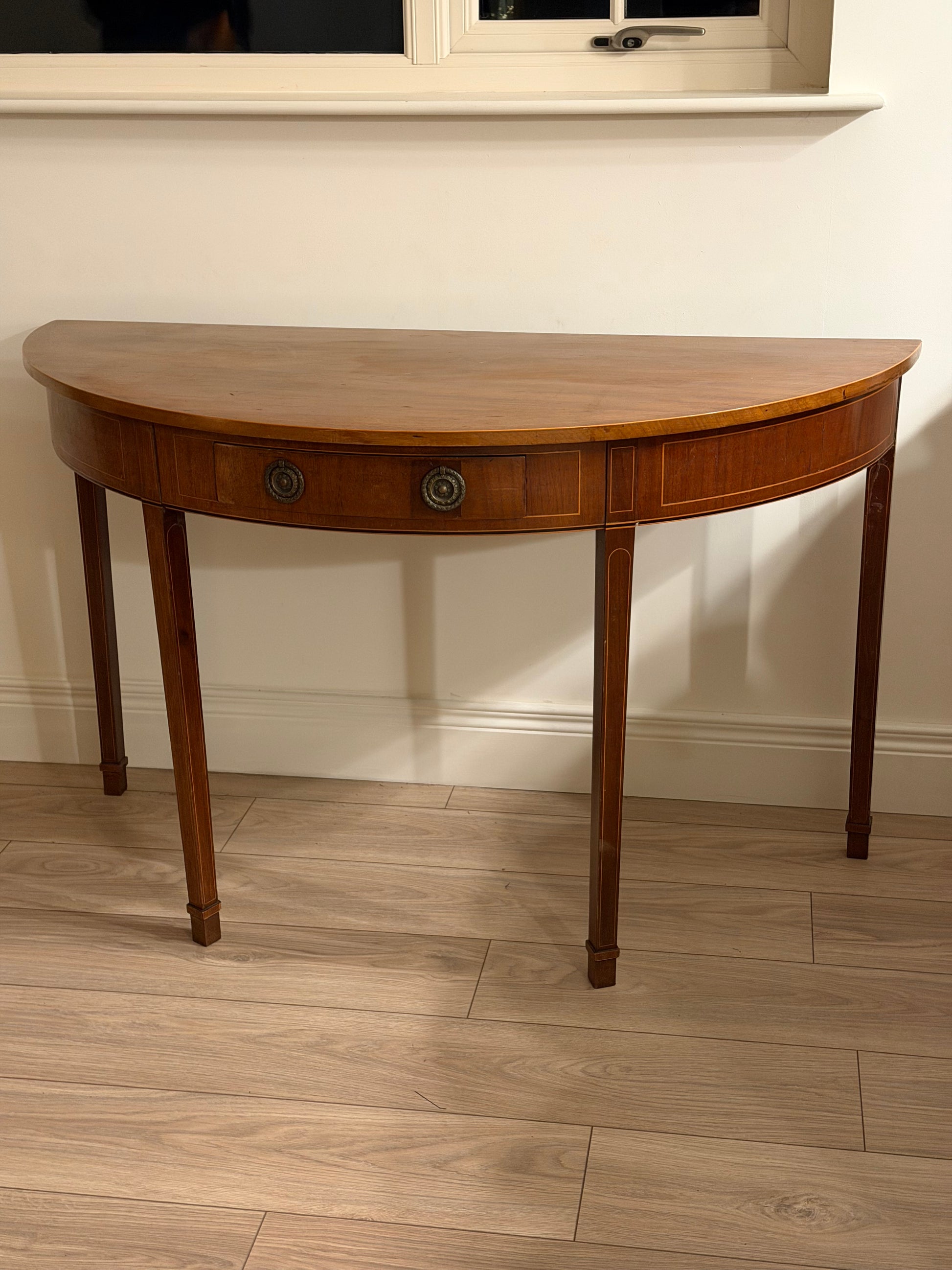 The table features a well-figured demi-lune top above a single frieze drawer, fitted with original decorative brass rosette handles.