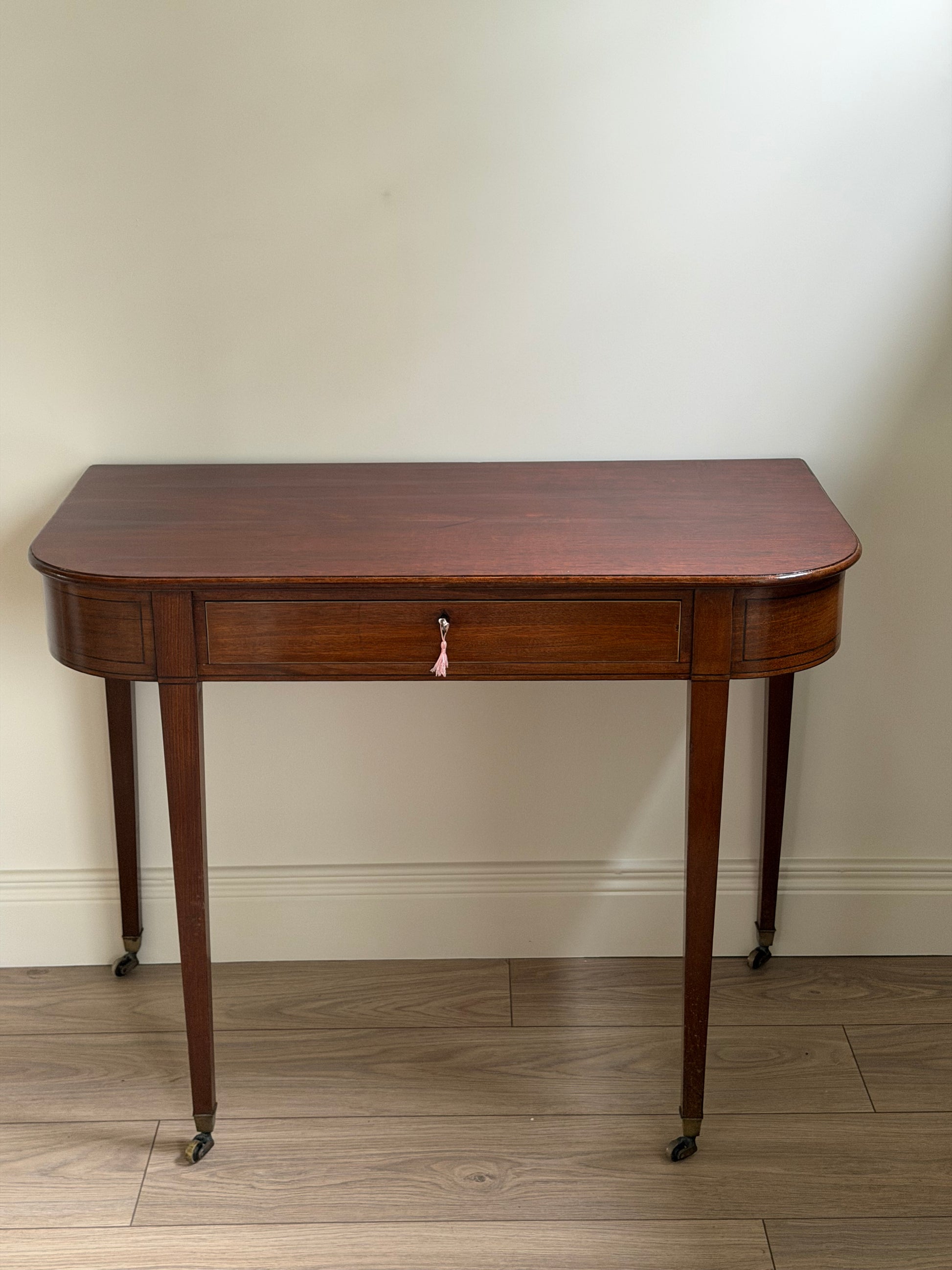A fine example of late Victorian craftsmanship, this elegant Sheraton Revival side table dates to circa 1890. Made from richly toned mahogany, it features a beautifully figured top with rounded front corners, subtle boxwood string inlay, and a single drawer with brass escutcheon and key. Raised on classic tapering legs with original brass castors, the table combines timeless neoclassical style with practical elegance.